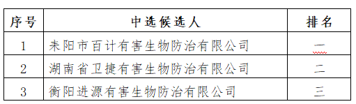 衡糧集團庫區(qū)白蟻防治服務(wù)項目(比選編號BX-015)于2025年10月20日下午14點30分進行了比選活動。經(jīng)評審小組綜合評審,現(xiàn)將中選候選人排名結(jié)果公示如下: